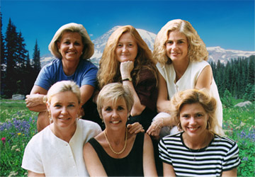![]() Shown below, The Sushi Group, circa 1995. Clockwise from top left, Lynne, me, Holly, Becky, Glenna and Missy. This photo was actually taken on the back steps of Becky's house, but I dropped in the background to give it that Alpine Feel for some holiday placemats when it was my turn to host the Sushi Christmas Party.